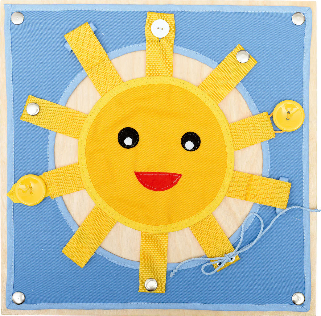 Afmeting: 35 x 35 cm Met verschillende soorten bevestigingen op de zon kunt u uw vingers oefenen en leert u de basisvaardigheden die nodig zijn bij het aankleden.