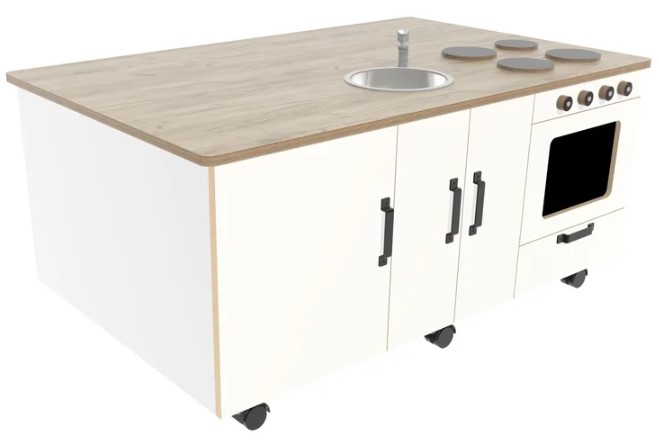 Verrijdbare kinderkeuken met oventje, spoelbak en fornuis.