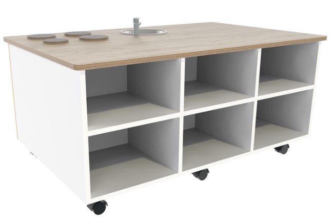 De achterzijde van het speel-kookeiland is voorzien van vakken.