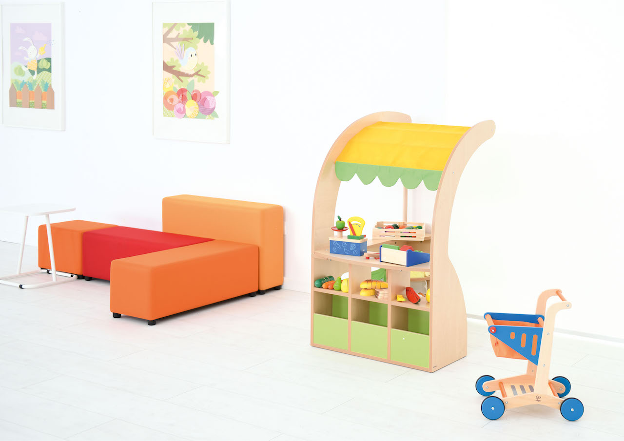 Winkel met veel uitstalmogelijkheden en een leuk stoffen dakje.