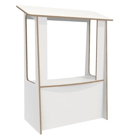 Het kraampje is voorzien van een dak, toonbank en legplank.