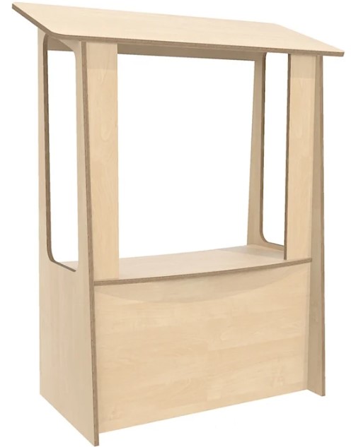 Het kraampje is voorzien van een dak, toonbank en legplank.
