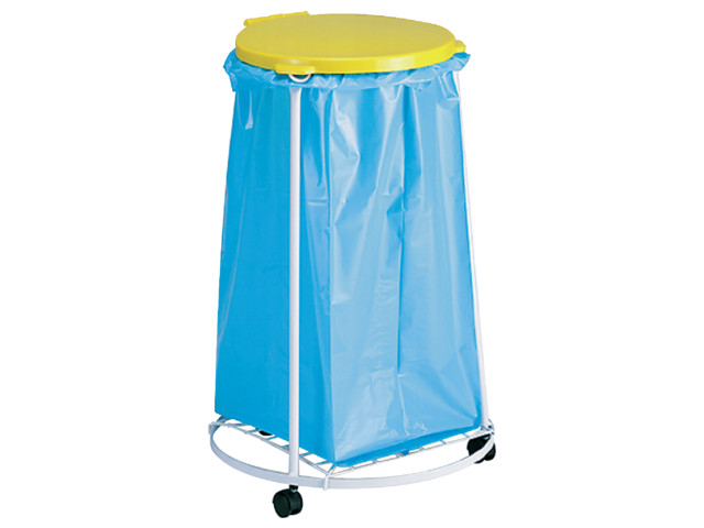 Handige witte metalen standaard met een geel kunststof deksel om grote afvalzakken in op te hangen