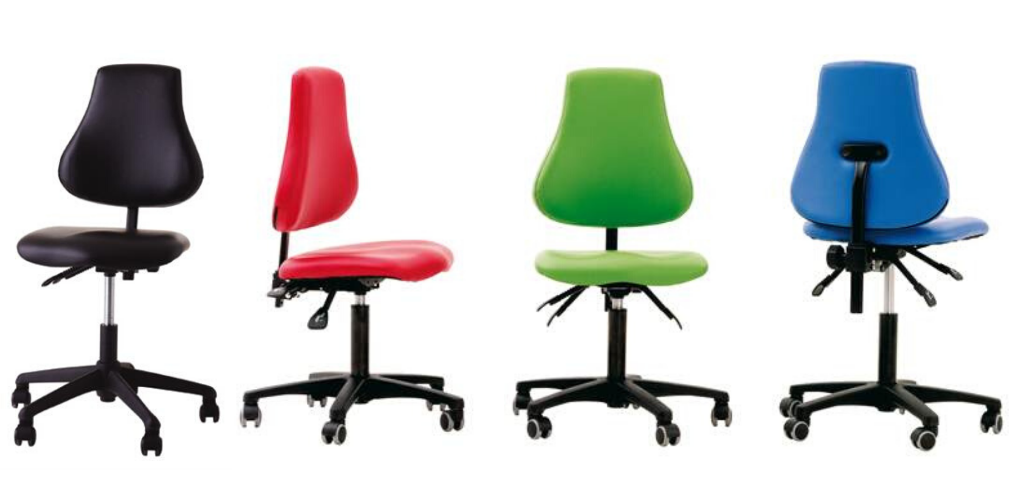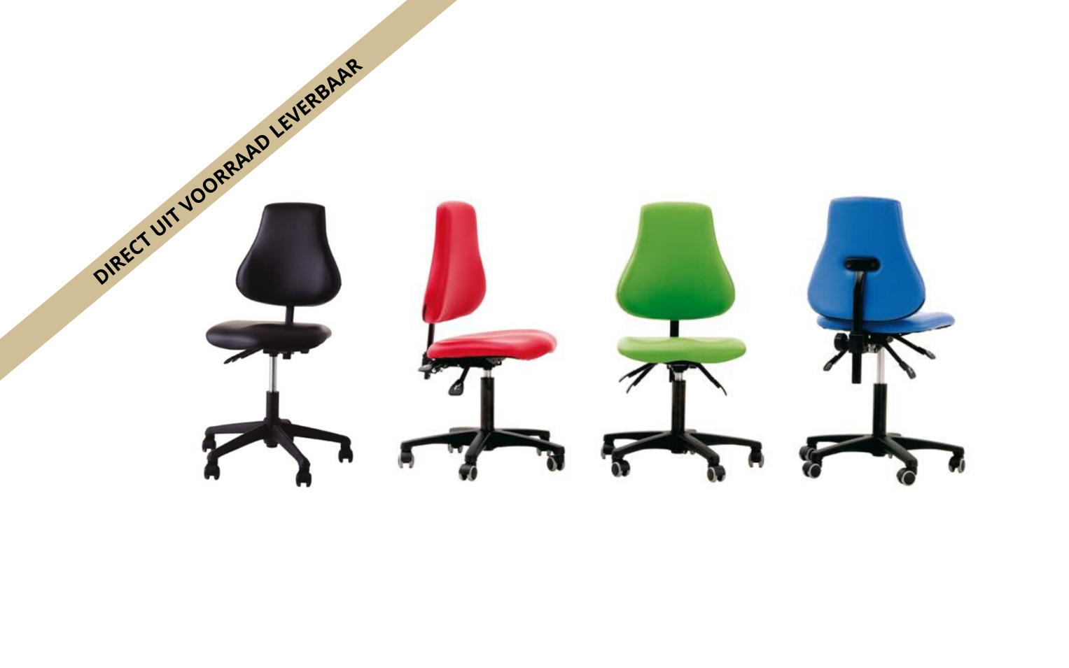 Deze leidsterstoel is leverbaar in de kleuren rood, blauw, zwart en lime groen.