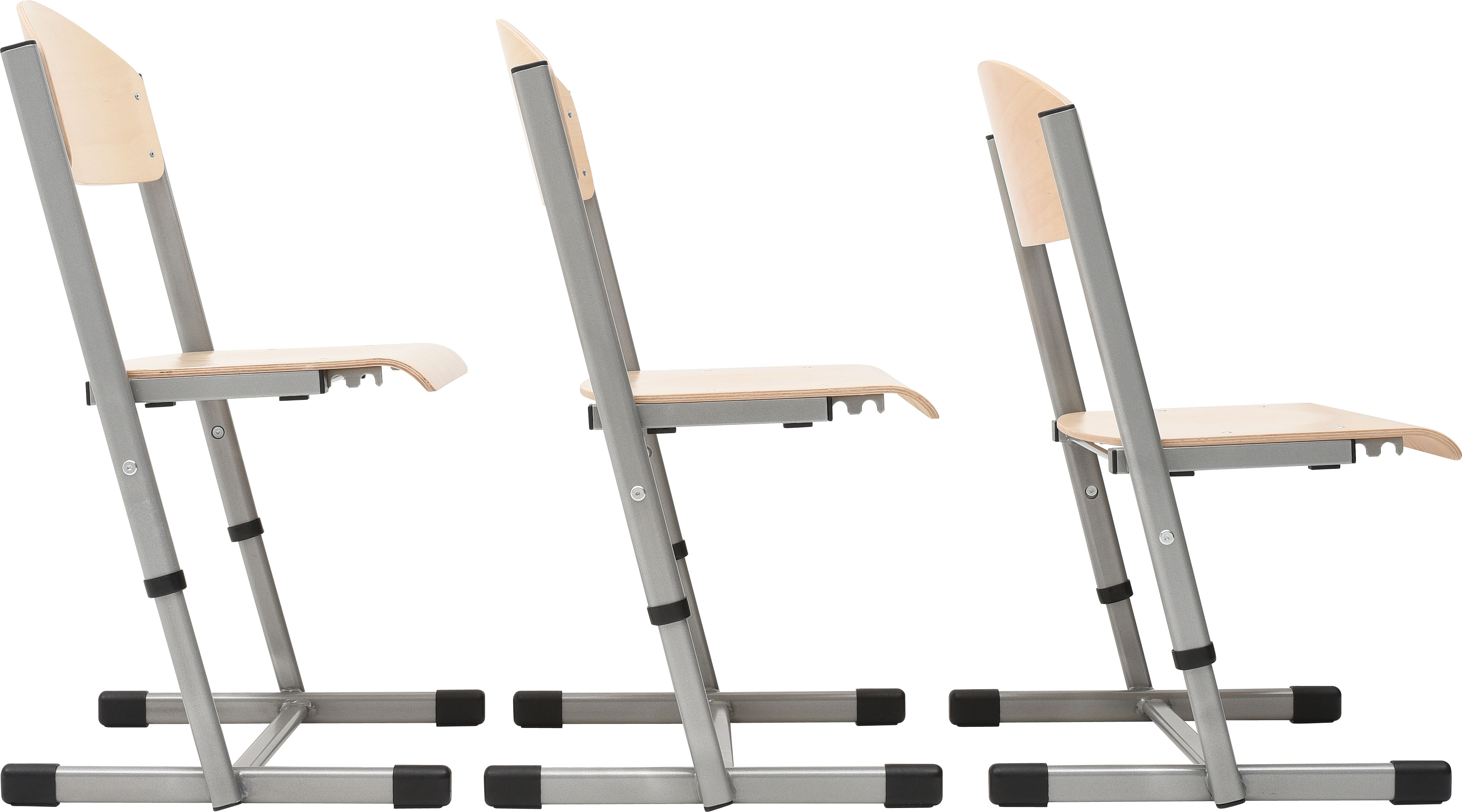 Stoelen zijn stapelbaar, in 3 hoogtes verstelbaar 38, 42 en 46 cm en het frame is verkrijgbaar in in 5 kleuren (rood, blauw, geel, groen en zilver)