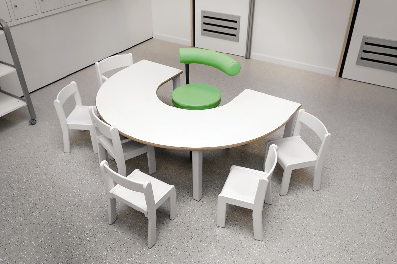 Compacte instructietafel met krasbestendig HPL toplaag in houtdecor of kleur naar keuze.