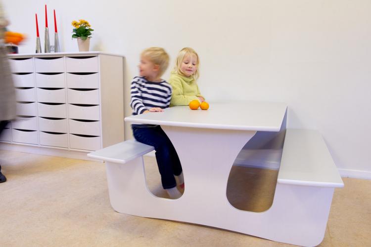 Klaptafel gemaakt van 18 mm wit gepigmenteerd berken multiplex met lichtgrijs duurzaam laminaat op tafel en banken,