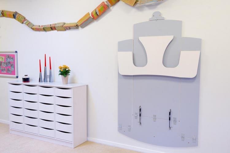 Klaptafel met geïntegreerde banken om aan de muur te hangen bespaart ruimte, die kan worden gebruikt voor spel en ontwikkeling.