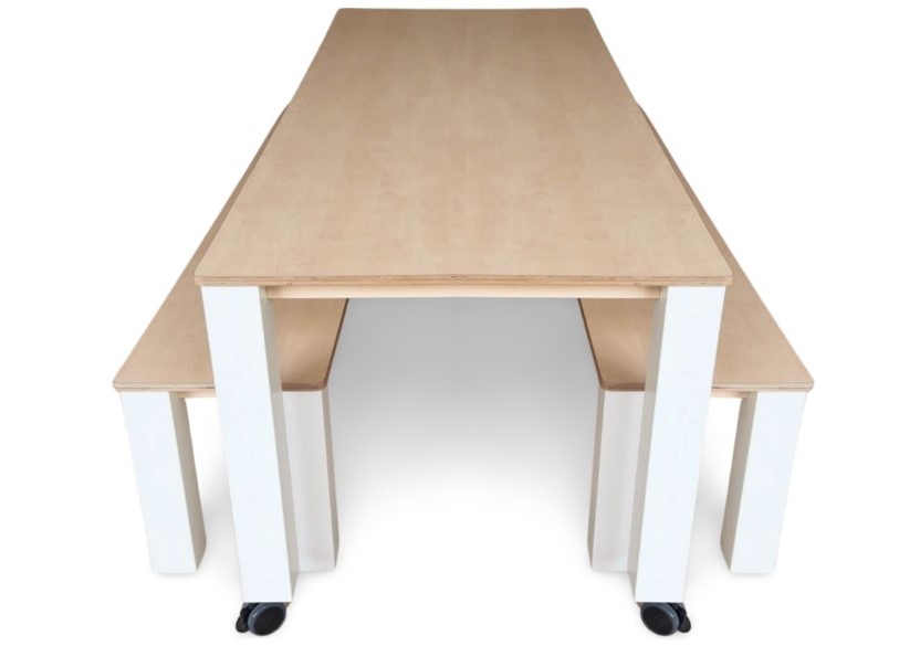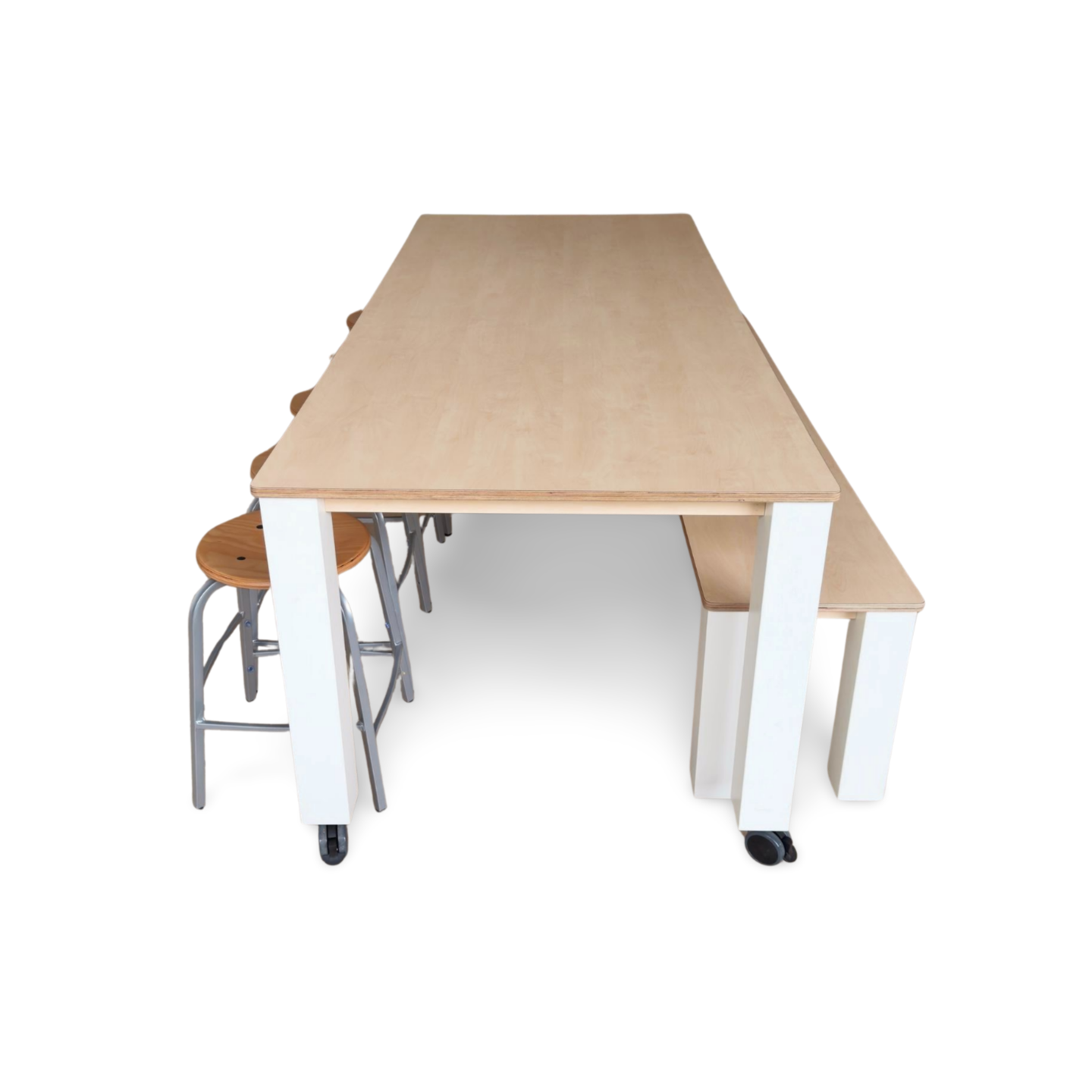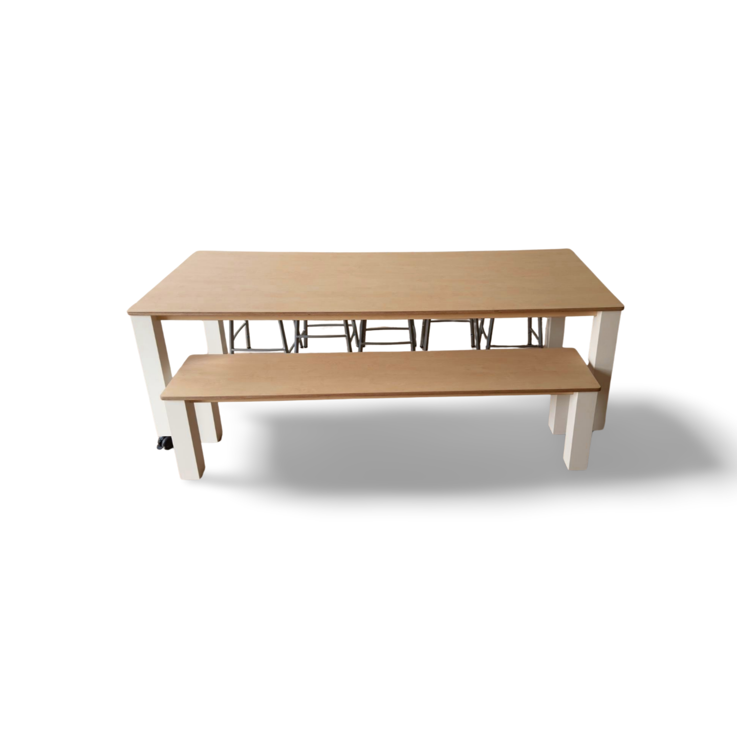 Robuuste tafel lengte 160 cm x breedte 80 cm met rechte massief houten poten. Onder de tafel zijn massief houten poten gemonteerd. Optioneel kan ook een set geremde wielen worden toegevoegd. Voor de poten past robuuste bank L160 cm |