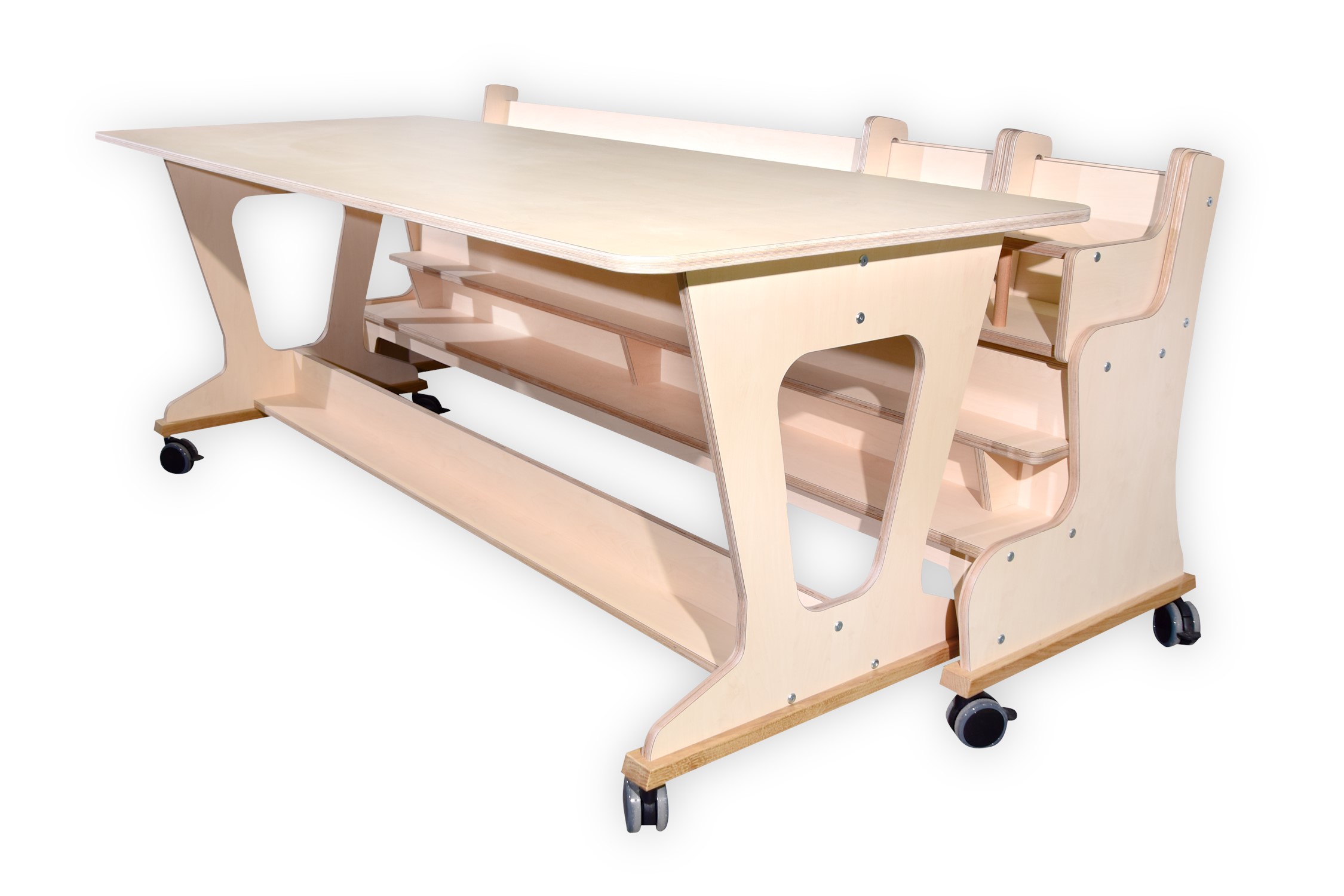 De tafel en banken zijn opgebouwd uit 18mm berken multiplex met witte hpl toplaag,