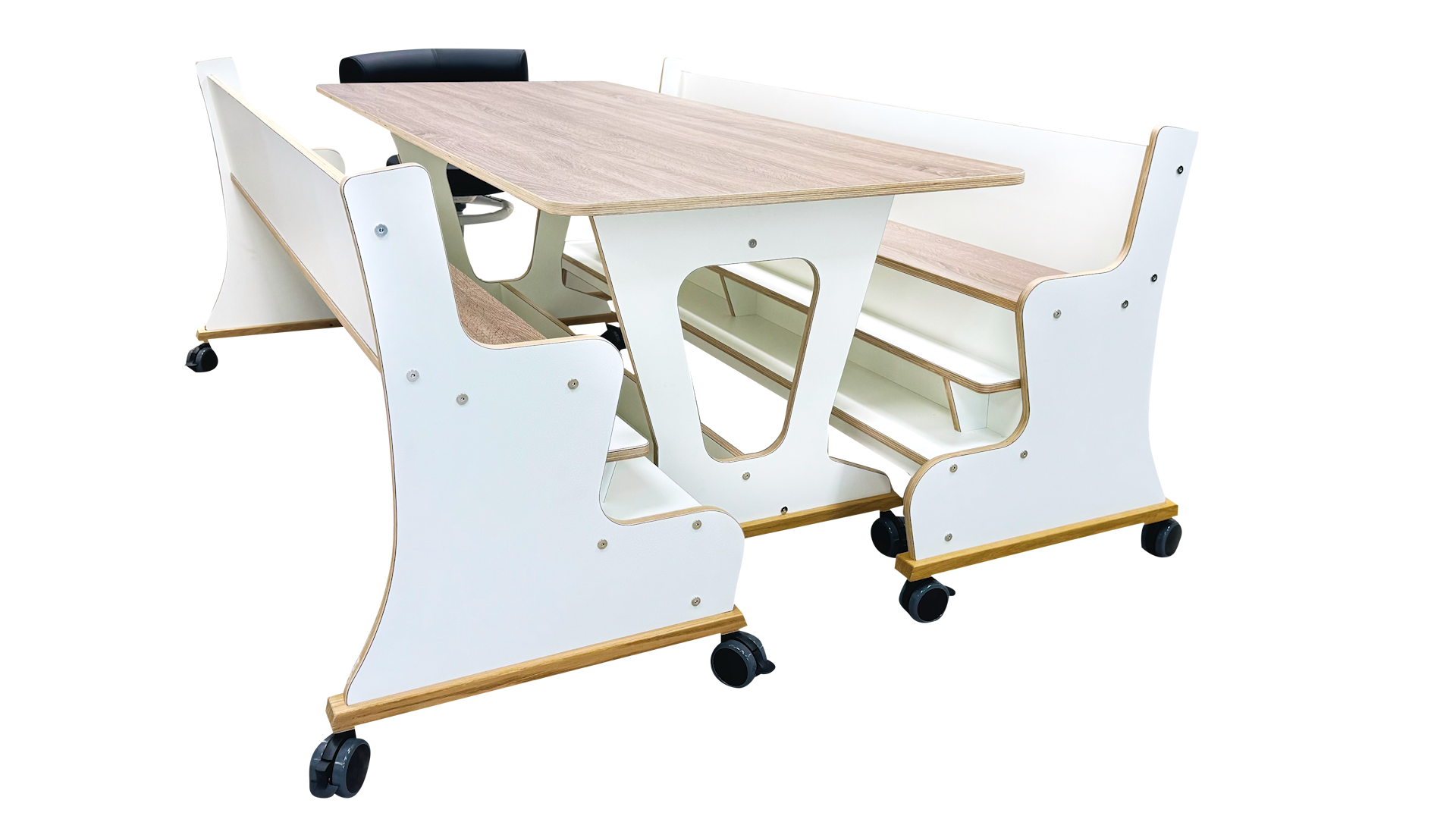 De tafel en banken zijn opgebouwd uit 18mm berken multiplex met witte hpl toplaag,