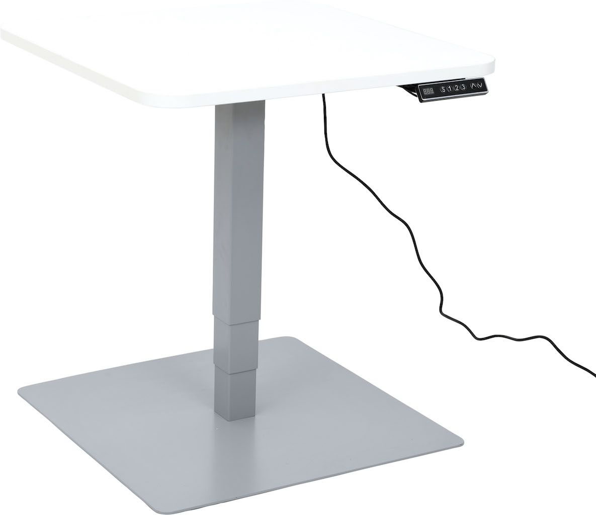 Ronde stabiele tafel met vierkante poten met soepele elektrische hoogteverstelling.
