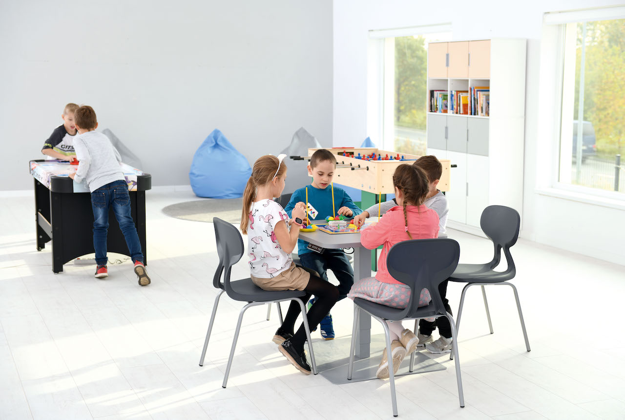 Deze tafel kan niet alleen met stoelen gecombineerd worden maar ook met treinbanken.